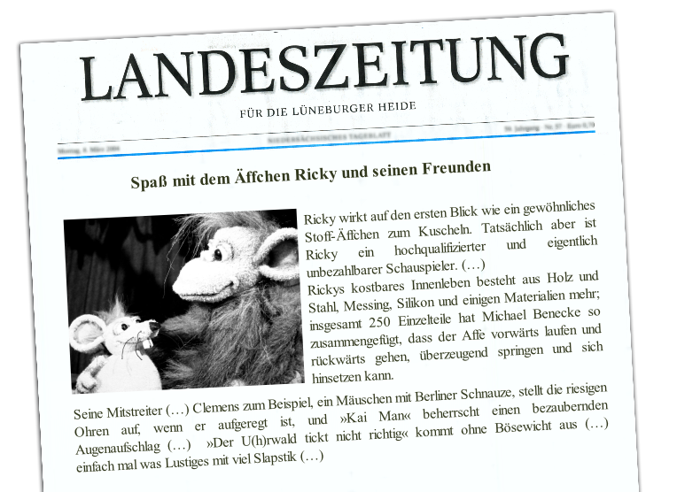 Seminare Kontakt Home Impressum Seminare Kontakt Über uns Ueber Uns Zur Inszenierung Zur Inszenierung Zur Inszenierung Zur Inszenierung Zur Inszenierung Zur Inszenierung Zur Inszenierung Zur Inszenierung Zur Inszenierung … ist der erste Teil der tierischen Ricki-und-Clemens-Trilogie. Altersempfehlung 4 Jahre 10 Jahre Das Team: Idee: Sylvia und Michael Hepe „Benecke“ Spiel: Michael Hepe „Benecke“ Regie: Sylvia Hepe Musik: Karl F. Parnow-Kloth Figuren und Bühne: Michael Hepe „Benecke“  Vorstellungsdauer: ca. 40 – 45 Min.