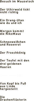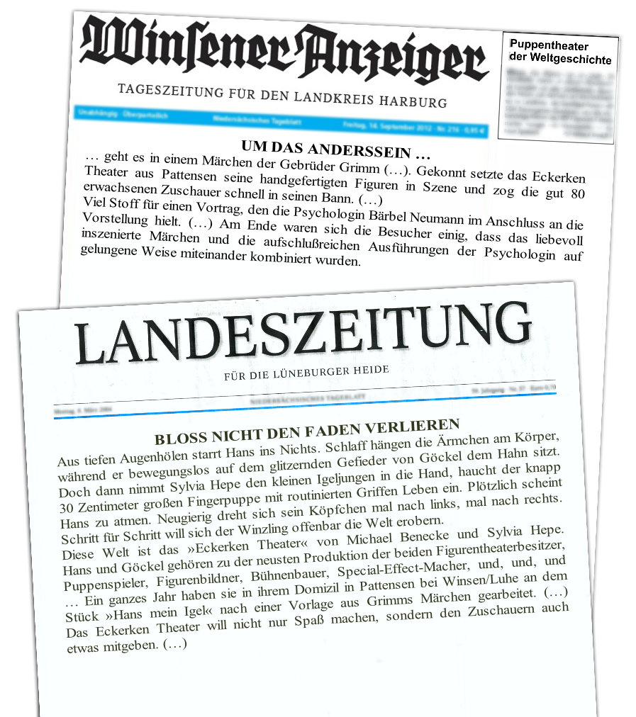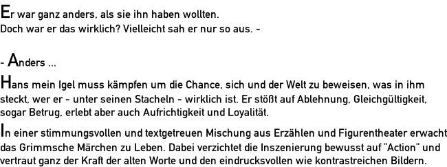 Seminare Kontakt Home Impressum Seminare Kontakt Über uns Ueber Uns Zur Inszenierung Zur Inszenierung Zur Inszenierung Zur Inszenierung Zur Inszenierung Zur Inszenierung Zur Inszenierung Zur Inszenierung Zur Inszenierung Altersempfehlung 12 Jahre 99 Jahre Das Team: Bearbeitung und Spiel: Sylvia Hepe Regie: Michael Hepe „Benecke“ Musik: Karl F. Parnow-Kloth Figuren: Michael Hepe „Benecke“ nach Entwürfen von Sylvia Hepe Bühne: Michael Hepe „Benecke“  Vorstellungsdauer: ca. 40 – 45 Min.